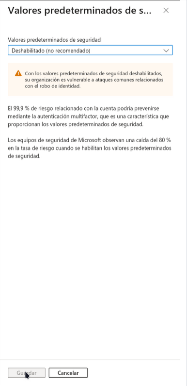4. Al lado derecho de la pantalla aparecerán los controles para activar o desactivar los valores predeterminados de seguridad, seleccione la opción Deshabilitado (no recomendado) y luego haga clic en el botón Guardar.